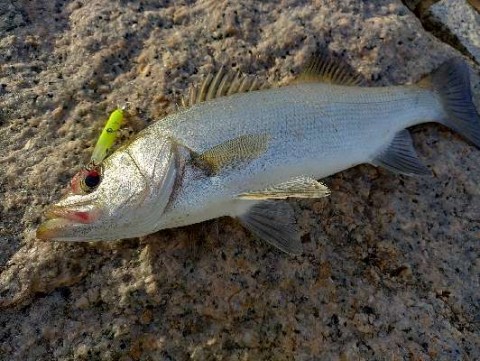 波打ち際にベイトは見えていて、メッキいないかな〜とキャストしていると、20cm未満のマイクロセイゴが何回か当たって