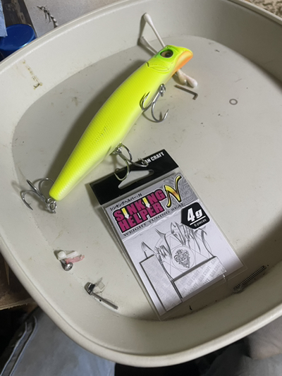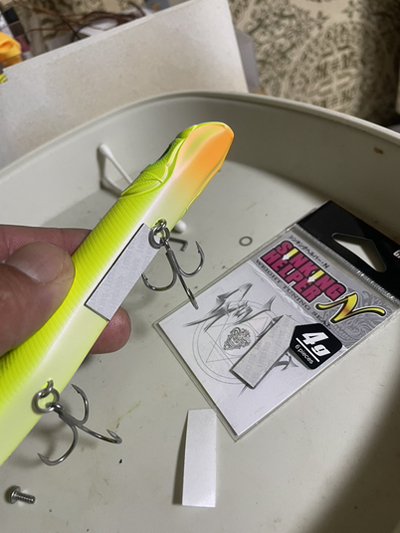 ウェイトシールはガンクラフトのシンキングヘルパー4g。厚みがありコンパクトなシールで、カゲロウのベリーにピッタリなサイズ。貼る位置はフロントフックのアイのすぐ後ろ、いろいろ試した結果ここが一番泳ぎが安定しているように思います。