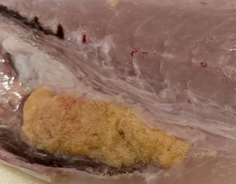 ようやく尺オーバーをキャチし一安心。するとすぐに船首付近のお客さんが39cmをキャッチして船中のお客さん達皆が40cmオーバーを期待し1時間ほど皆さん22cm〜尺を連発したが40cmを越えるサイズはキャッチできず納竿時間となった。自宅に帰りアジを捌くと大型は卵巣や精巣が入っていてプリスポーン状態だった。