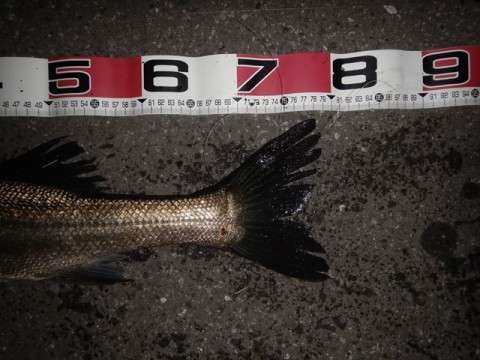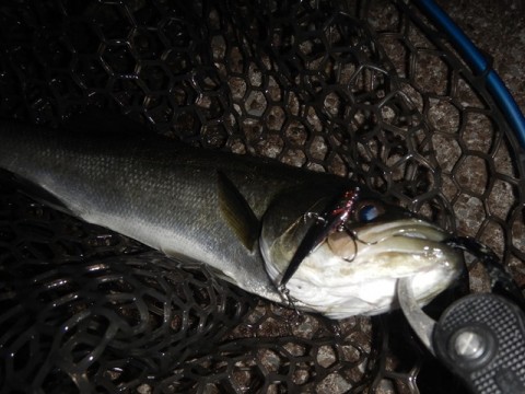 まあまあサイズのスレ掛かりだったか?と疑いましたがライトで照らすとランカーは有りそうな背中が見えました。