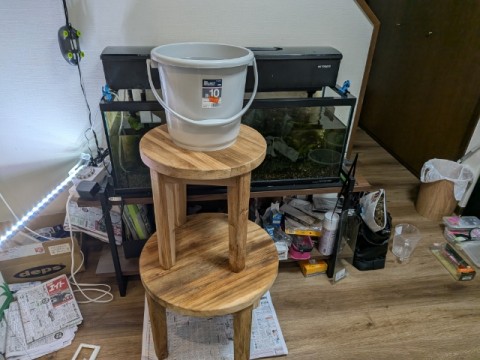 こっちの水槽は底砂が砂利だからあまり気を遣う必要はないかもしれないけど、バケツから直接入れると底から巻き上がって濁るからこのように椅子を重ねて