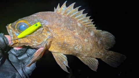 この夜、砂場に多少ウネリが入っていたことで早々に見切って隣接した小さな岩場に移り、最初のバイトはシーバスだったが