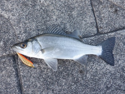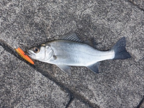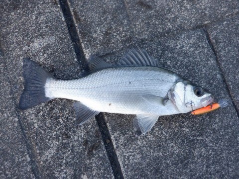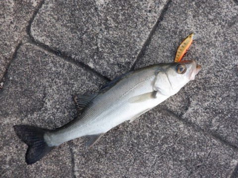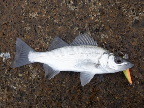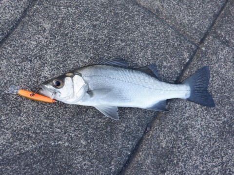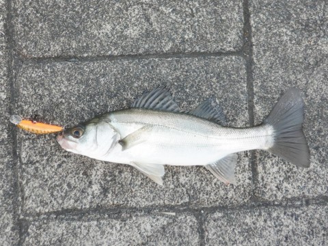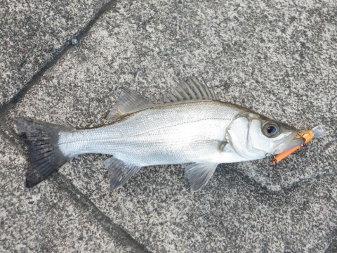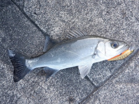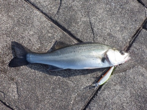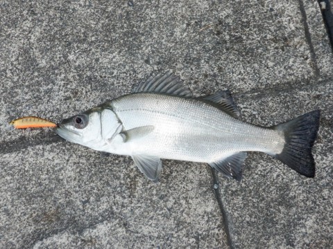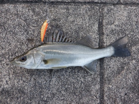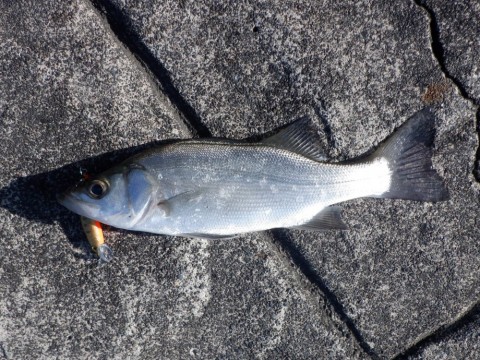 第1投目は無難にSMITH/D-CONTACTⅡ50からスタート。ベイトは相変わらず沢山入っているようなので、カウントダウンせずにトウィッチ開始。するといきなり食ってきました。ジャンプします。セイゴですね。1投1バイトで当たって来ますが、全てセイゴでした。セイゴは釣るのがなかなか難しく、ジャンプでフックアウトする事数回。やっと釣り上げたのはマルセイゴでした。