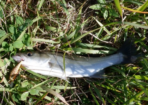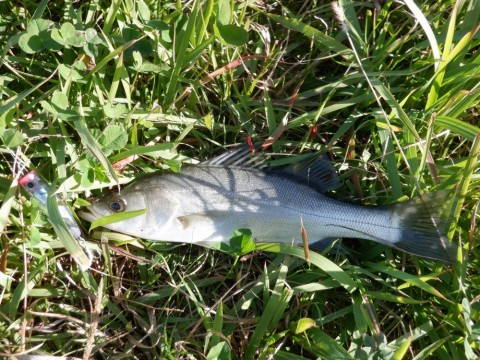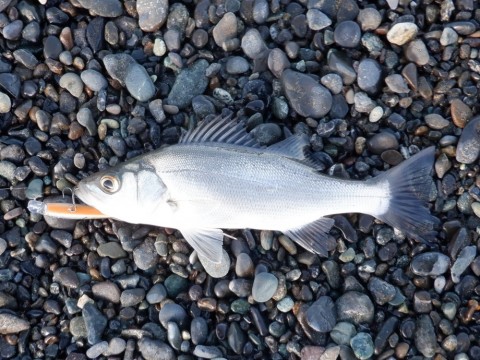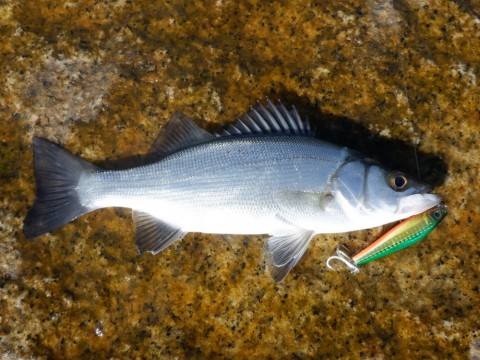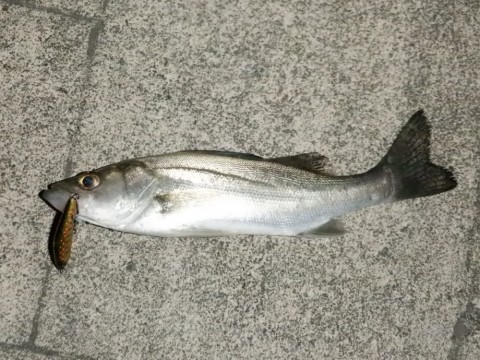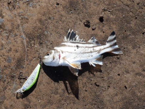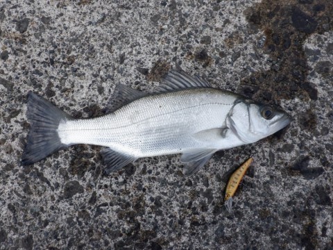 この魚はそんな中、逆にシルエットの大きめのルアーに変えてリアクションで食わせた36,7㎝のマルセイゴ。SMITH/D-CONTACT 72のイレギュラーダートでやっと食わせました。