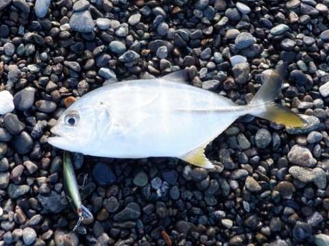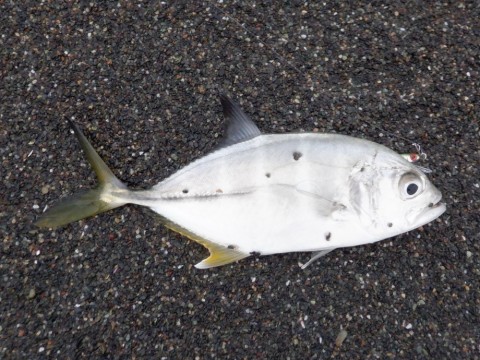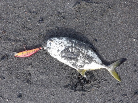 ギンガメッキでした!手尺で測って17,8㎝。小さい魚ですが、サーフで釣れたのは嬉しい!ギンガメアジは群れで行動することが多いので、連発を期待しましたがその後海は沈黙。