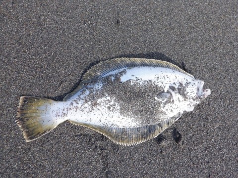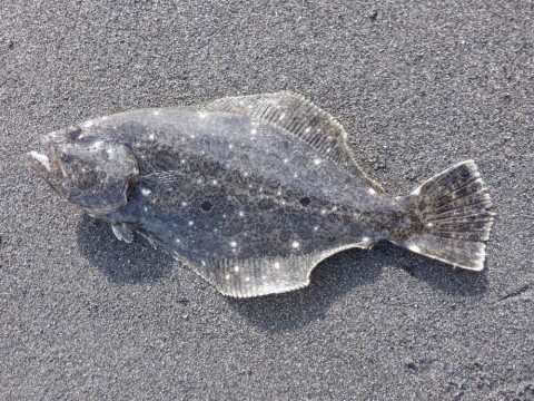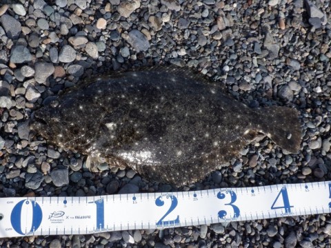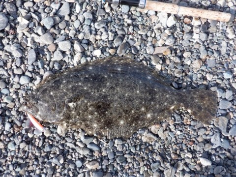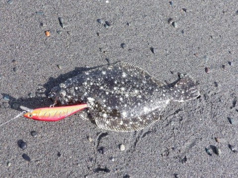 こいつは最初こそ重たいばかりで引きませんでしたが、リールをゴリ巻きすると凄いトルクで引っ張り始めました。強めに締め込んでいたはずのドラグが鳴きます。さらにドラグを締め込んで、ラインテンションが抜けないように注意しながら応戦。寄せ波に乗せて引き上げようとしたけど乗せきれず、再び沖の方へ翻ったシルエットは…ヒラメでした。久々のナイスサイズ!こいつは獲っておきたい!無理をせずもう一度寄せ波に乗せ、何とか引きずり上げますが、かなりの重さで無理するとリーダーが切れそうなので、フィッシュグリップで捕まえました。