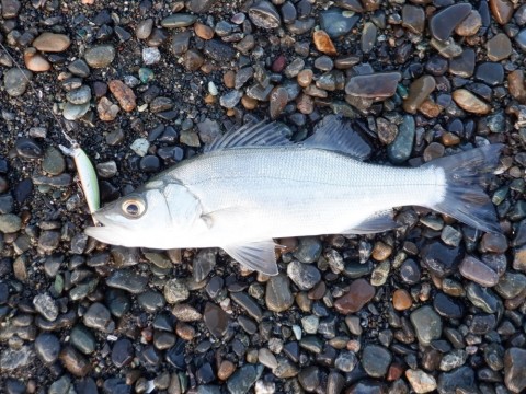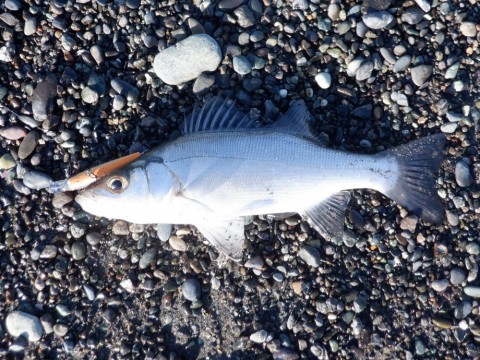 しばらくは渋い今シーズンの中でも一番良いと言われている護岸からスタートしましたが、ボラの群れは見かけるもののその他のベイトが薄く、全くバイトが出ません。仕方なくサーフに移り、ほとんど釣れる気がしないまま適当にトウィッチを続けます。風は北東、推定4m/s。フォローウィンドに乗ってルアーがよく飛びます。最近見かけるベイトのサイズがやや大きめだったので、この時投げていたのはSMITH/D-CONTACT63。サーフに移動して概ね5投目くらいで、いきなりガツン!とヒットしました。