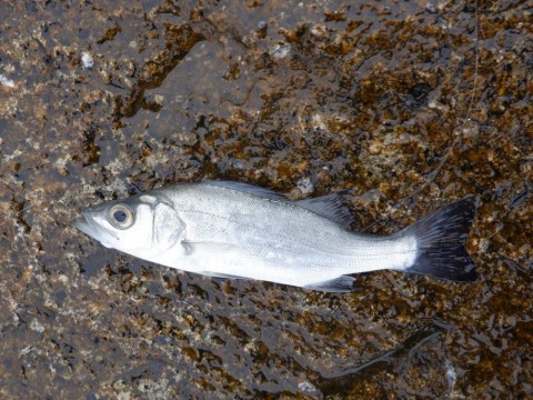 予報の通り、午後からは南風が強くなってきました。益々海が荒れます。何度も頭から潮を被りました。しかし既に時合いは過ぎたようで、メッキからの反応はありません。手前側では度々トウゴロウイワシのボイルが見られますが、セイゴに追われているようです。ならばせめてこのセイゴを釣ってやろうとネチネチとミノーで攻めると、やっとこさバイト。