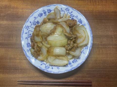 豚コマ肉を片栗粉にしっかりまぶし、揚げ焼にしたものに、玉葱丸一個分を刻んで炒めます。味付けは醤油、酒、オイスターソース、砂糖少々に、中華出汁の「覇味」。