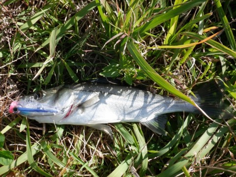 25㎝くらいのヒラセイゴでした。しかしその後が続かず…だんだん釣れる気がしなくなって、サーフに移動しようかな~なんて考えていました。そして毎度おなじみのように、こんな風に気が抜けている時に限ってバイトが出るから不思議です。ジャーク気味のトウィッチに、出し抜けにガツンッ!こいつも良く引きます。最近口切れでばらすことが多いので心配ですが、シモリ側に走られるのはまずいので少々強引にやり取りします。何とかゲット。