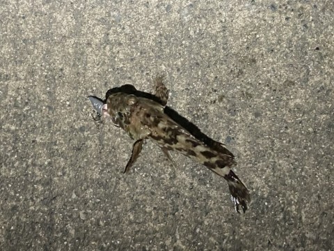 ダツの猛攻に耐え兼ね、場所を移動していきます。すると今度は、何だかゴミを引かけたようなバイトが出ました。全然引かないけど何か釣れているみたいです。いったい何者か…?