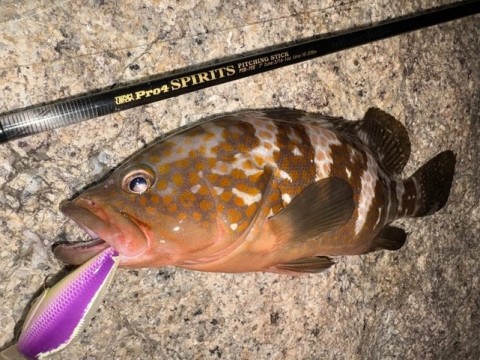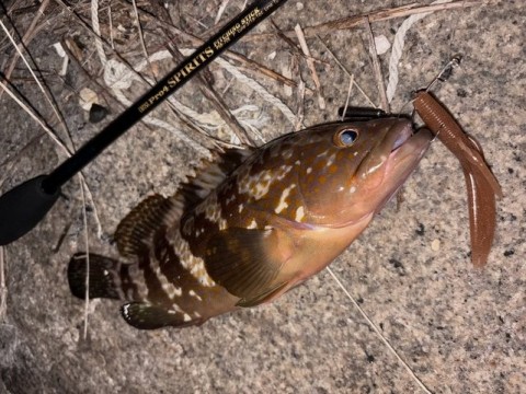 これまで岸から釣れる魚では最も高級なアコウは、ガシラ釣りの外道で釣れそうなものでしたが、何十年も軽量ジグヘッドリグで釣っていても全くお目にかかることはありませんでした。しかし、クランクベイトや10g前後のシンカーを使ったジカリグでは、ガシラはほとんど反応せず、釣れるのはアコウばかりになりました。(もちろん、ガシラと比べて個体数が圧倒的に少ないので、毎回うまく釣れるわけではありません。)