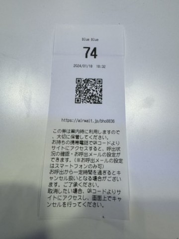 整理券にはQRコードが記載されておりQRコードからLINE登録して頂くとスマホに呼び出し通知が来るシステムとなっております。