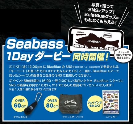BlueBlueルアーでシーバスパーティー2025フォトダービーにエントリー頂いたユーザー様にヤマツリフィッシングフェスBlueBlueブースにて、先着順で非売品ノベルティをプレゼント致します!!