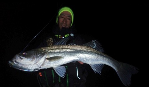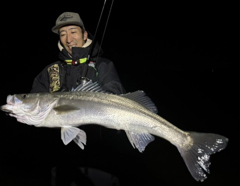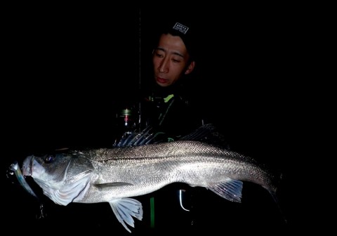 バスディテスターのタカヒト君。あっさりキャッチしたのは84cmのシーバス。ヒットルアーはハーデス。