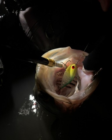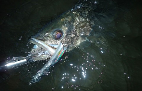 仲間のヒットしたシーバス。ジグザグベイトを丸呑みしている。ペンチではルアーが外せないということもあり、フックリムーバーの出番。シーバスの為にもフックリムーバーのありがたみを知ったワンシーンだった。