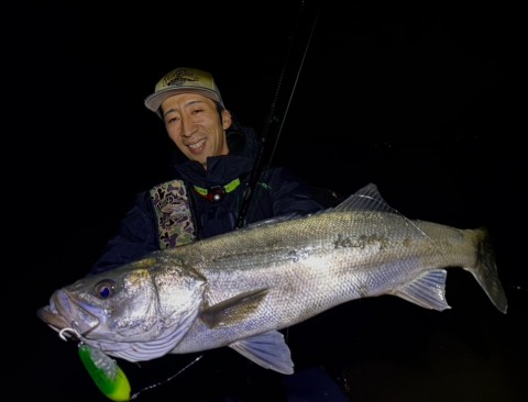 エアーマンことマコさん。ヒットルアーはハンマー120。ランカーに迫るシーバスだ。