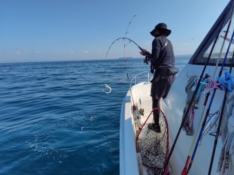 「魚探にたくさん映ってるよ」というので、ジギングしてみると自分にもヒット!これもキャッチ成功。二人とも釣れてひと安心。魚はまばらでも全然セレクティブでは無くて、タイミング合えば食う感じ。