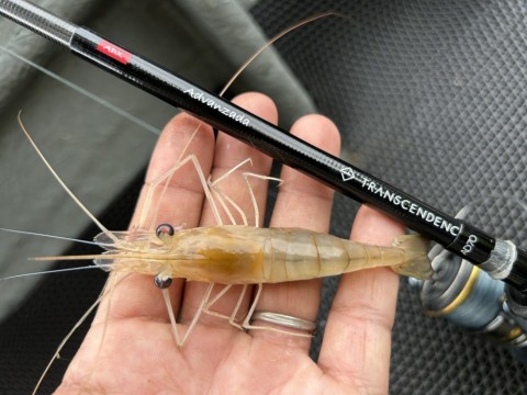 渋々言われたことを守っていると、エビらしい引きが!上がってきたのはメスのオニテナガエビでした!
