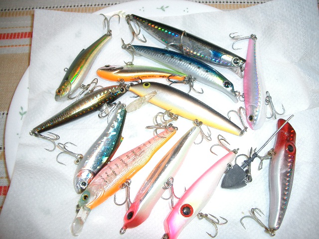 昨日の夜中から早朝まで、隅田川でこんだけのルアーほん投げてました。あいださんが、「そういう時は、しっかりゴム製品を使いなさい!」とおせーてくれたのに頭から抜けてましたぁ!上の方のP-ce100は、なんとぉ、名実ともに太っ腹の金ちゃんさんにもらっちゃったのよぉ〜ん。