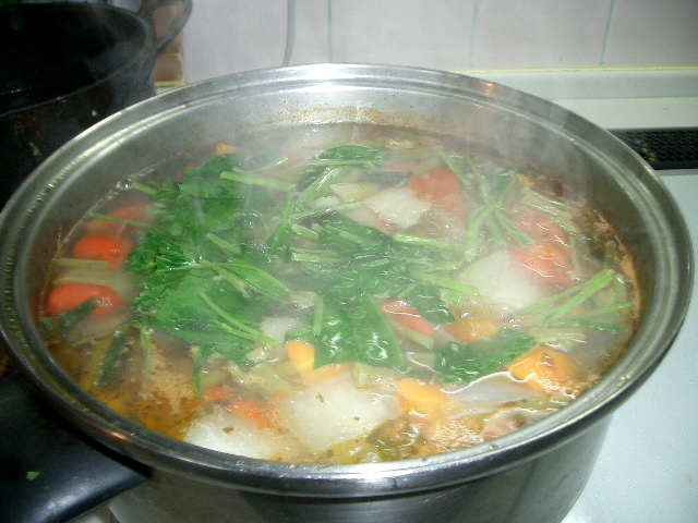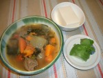 牛すね肉1.2Kgぶつ切りにして野菜・根菜(セロリ・玉葱・人参・冬瓜・トマト・クウシン菜)などとともにバジル・月桂樹・ローズマリーなどの乾燥の香草を入れて2時間煮込みました。