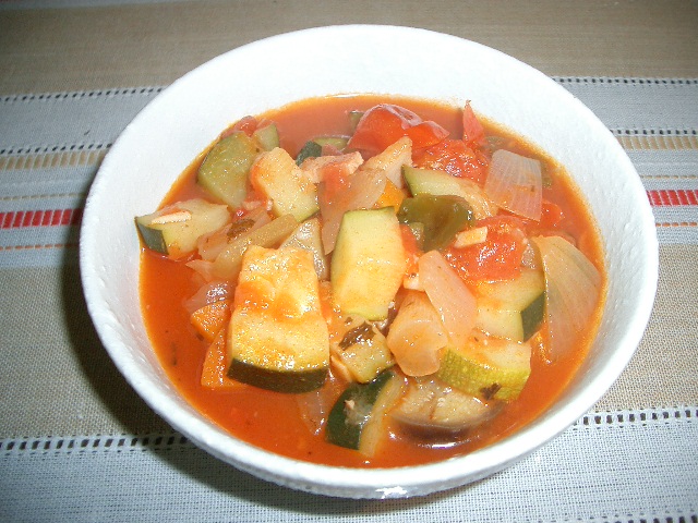 ラタトウユは夏の定番(夏野菜の煮込みだもんね!)。おいらは、こういう汁も結構好き。ブロックのベーコンを刻んで入れれば若い者は喜びます。ズッキーニがスーパーでも安く買えるようになりましたね。