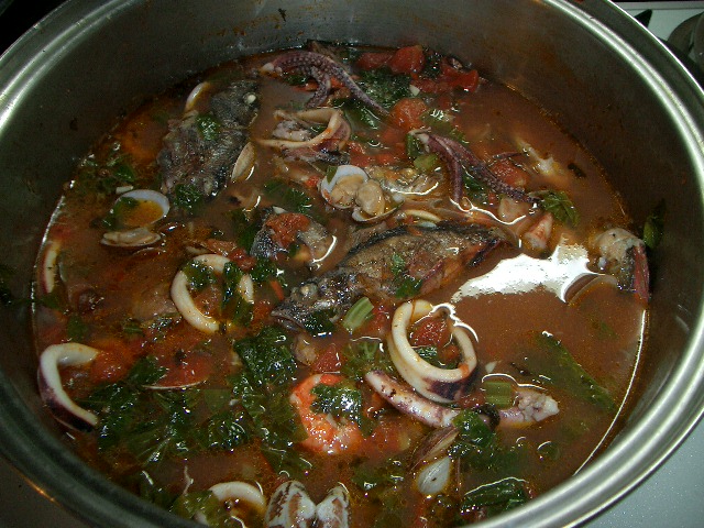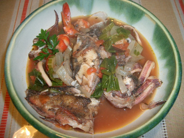 さばいた魚が77匹。で、カサゴ・メバルの小さいのは大鍋でブイヤベースにしちゃうのね。ホタテ、イカ、エビ、あさり、玉葱、セロリ、ちゃんとサフランやバジルも入ってんだからぁ。