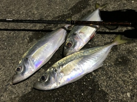 一投目のド表層で当たり、シーバスかな?と思ったら本命のアジ。立て続けにバイトがあるも乗らず、少しレンジを下げて探ると当たりがあり2匹追加。