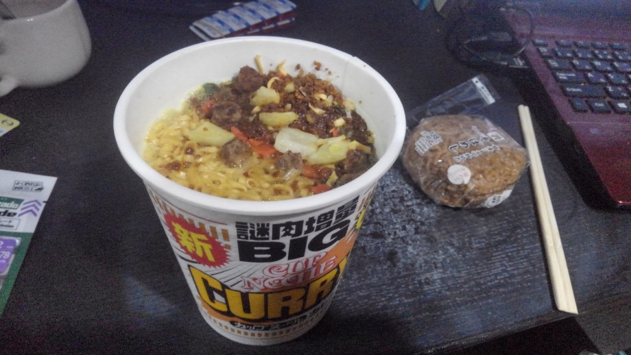 カレーヌードルBIGサイズ!(おいちゃんのささやかな贅沢なんだがここ最近の値上げラッシュのせいか内容量少なくなってねえか?)