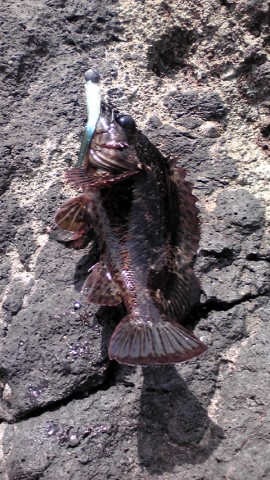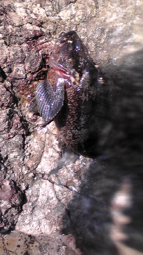 ゴロタのしたに竿をぶち込みラインを手で持ち誘うと、一発♪15㌢位
