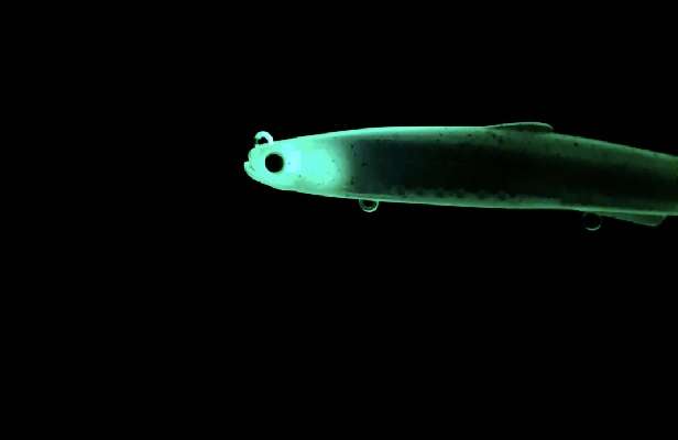 この小さなラメの面白いところは水中での主張。ヘッドからバック、ベリーへ走るグロー発光に対して、角度により超極極僅かですが呼応します。擬音表現では「ギラギラ」ではなく「チリッ」と。