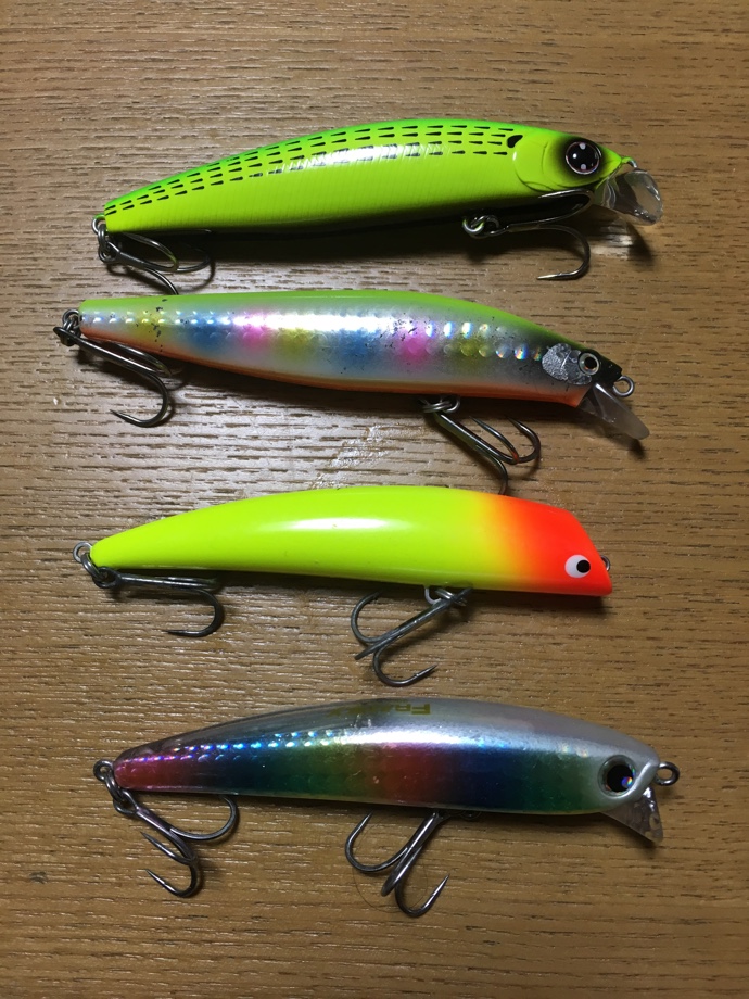 とりあえずルアーカラーに関しては、まずはアピール重視のチャート系カラーで揃えましょう。