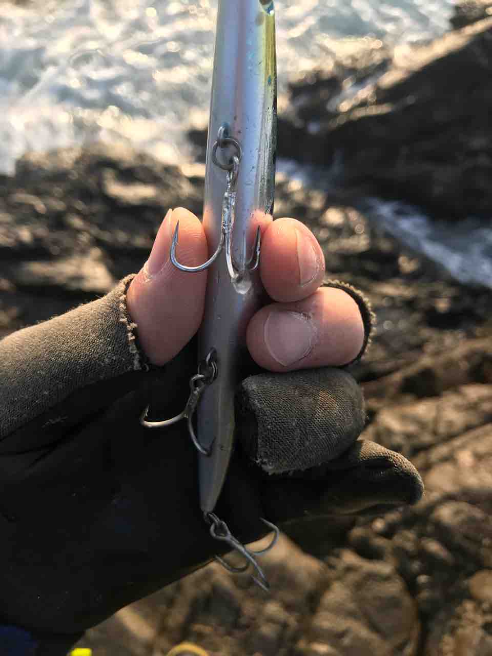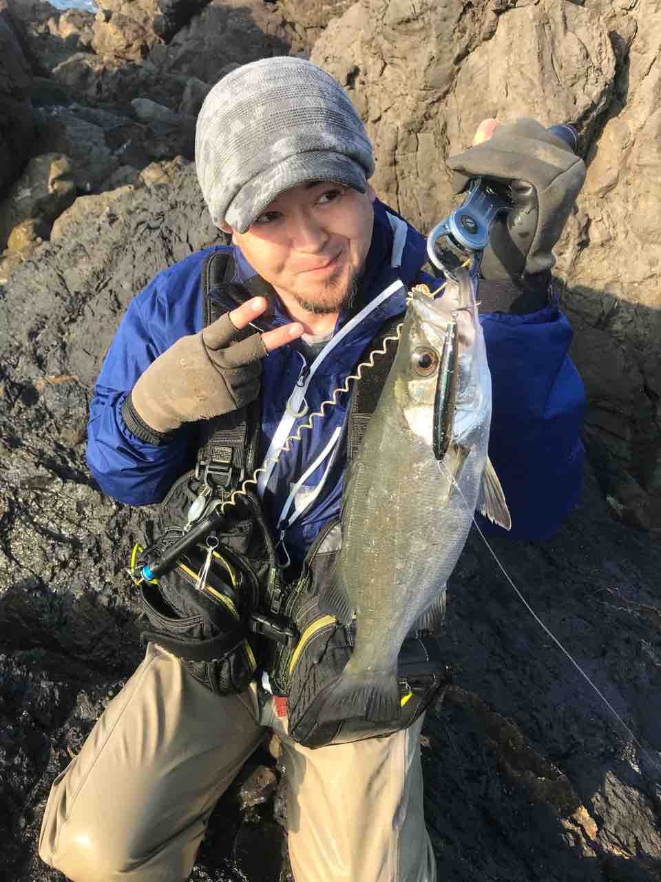 ゴリゴリ巻いてきて数メートル先の磯に魚ごと引っ掛かりましたが次の押し波で外れてくれて無事キャッチ