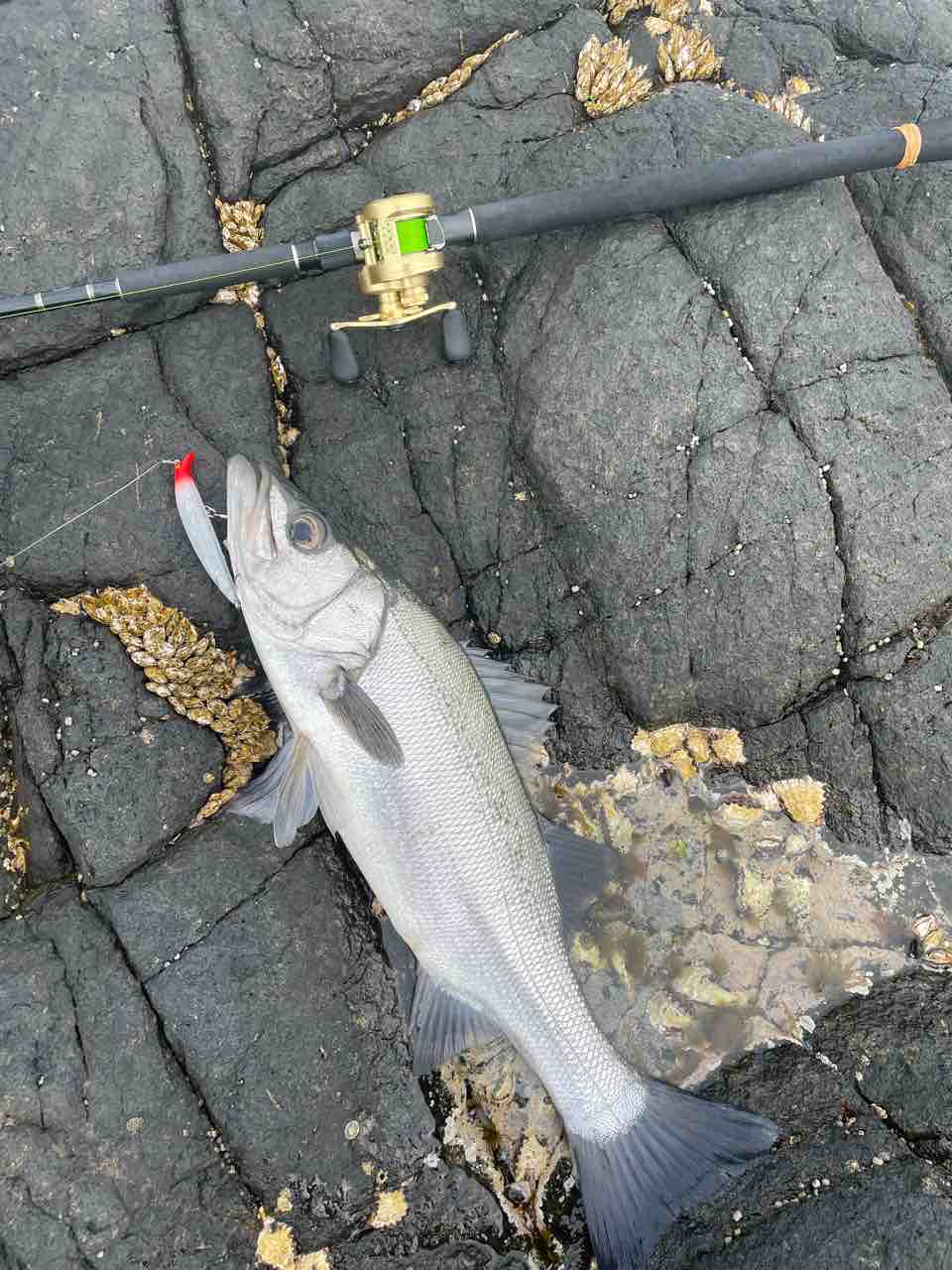 前にある磯を飛び越えさせながらキャッチするのでリーダーが痛むのが辛いところですが、1本釣れてくれただけで大満足です!