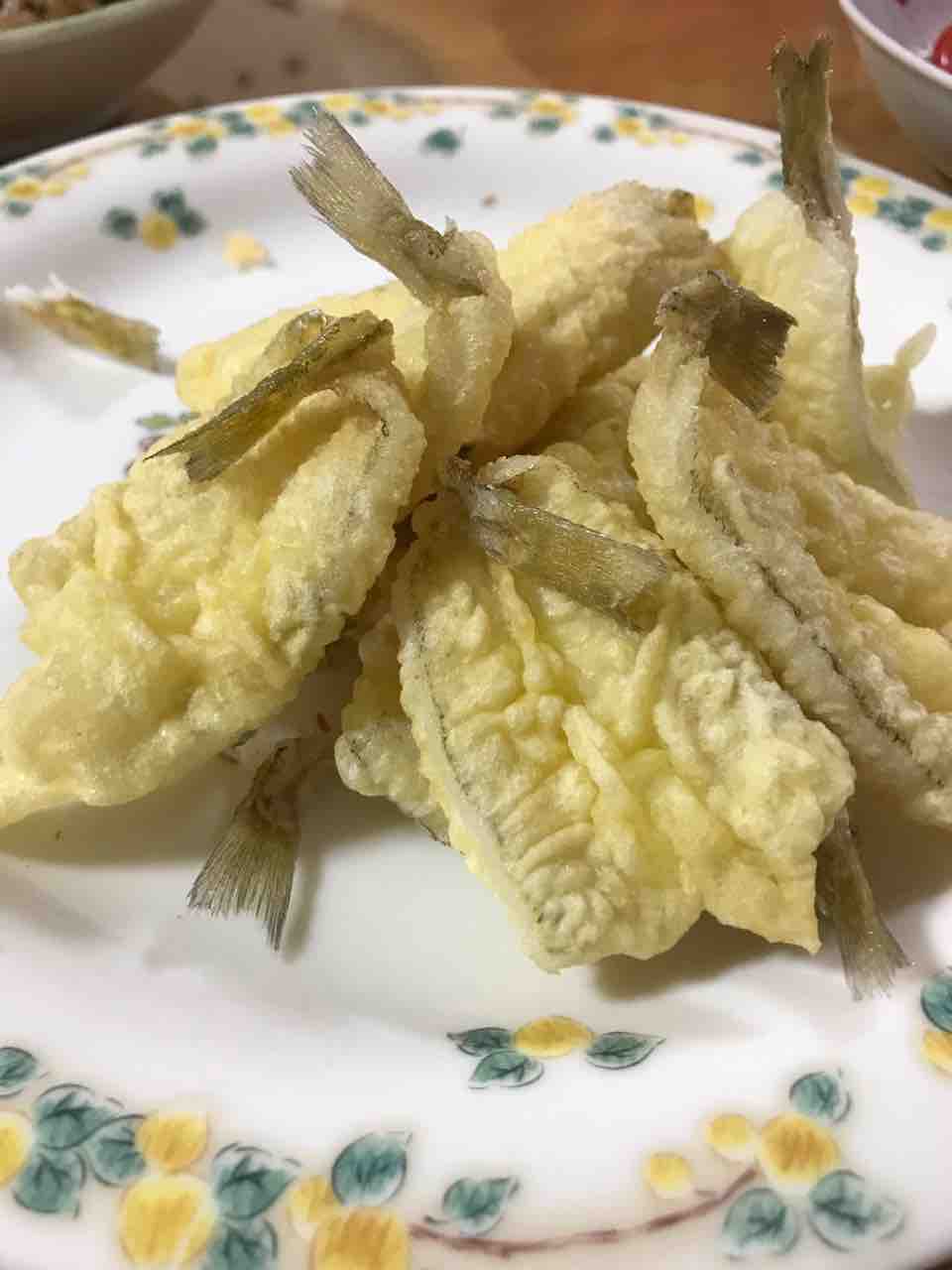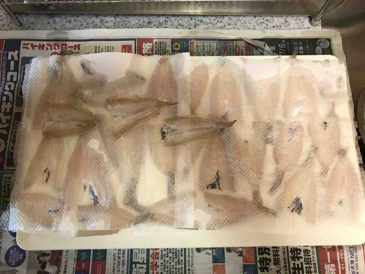 下手くそですが天ぷら用に捌いてキッチンペーパーで水気を切ります