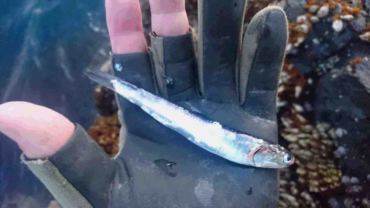 磯に上がるときに船のライトに驚いたイワシがギラギラッ!