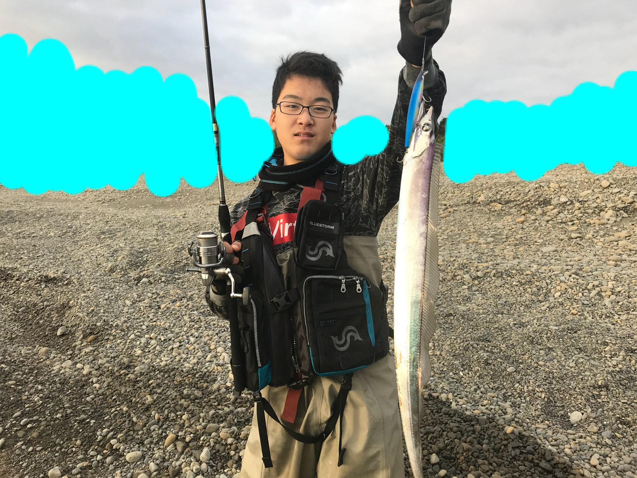 足りない飛距離をウェーディングでカバーしようと前に出て・・・ 波に押し倒されて転ぶ