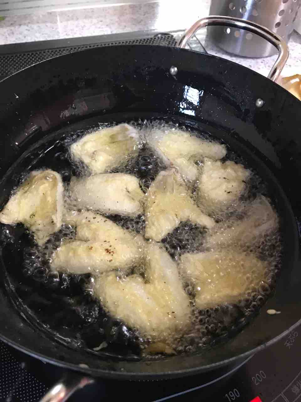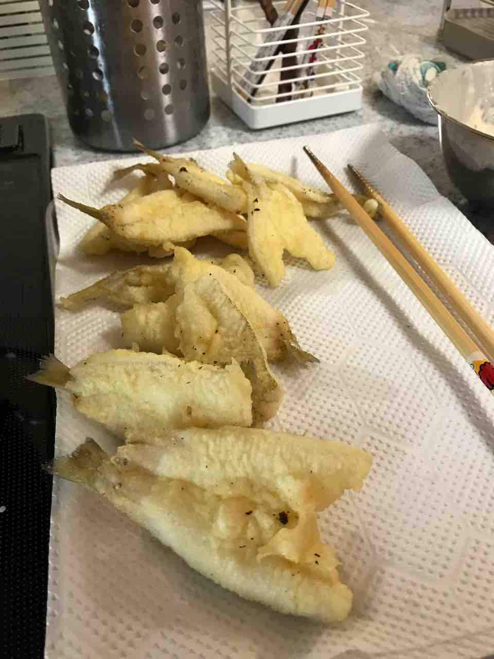 水分をよく拭き取ったらあとは天ぷら粉で揚げるだけ