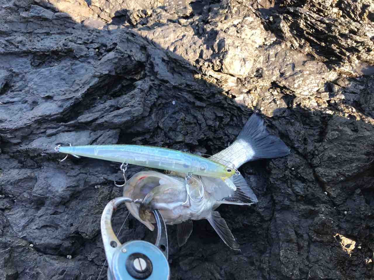 ロッドが曲がりラインもピンピンに張ってたので魚が外れた瞬間にルアーが飛んできて足元の磯にカランコローン!
