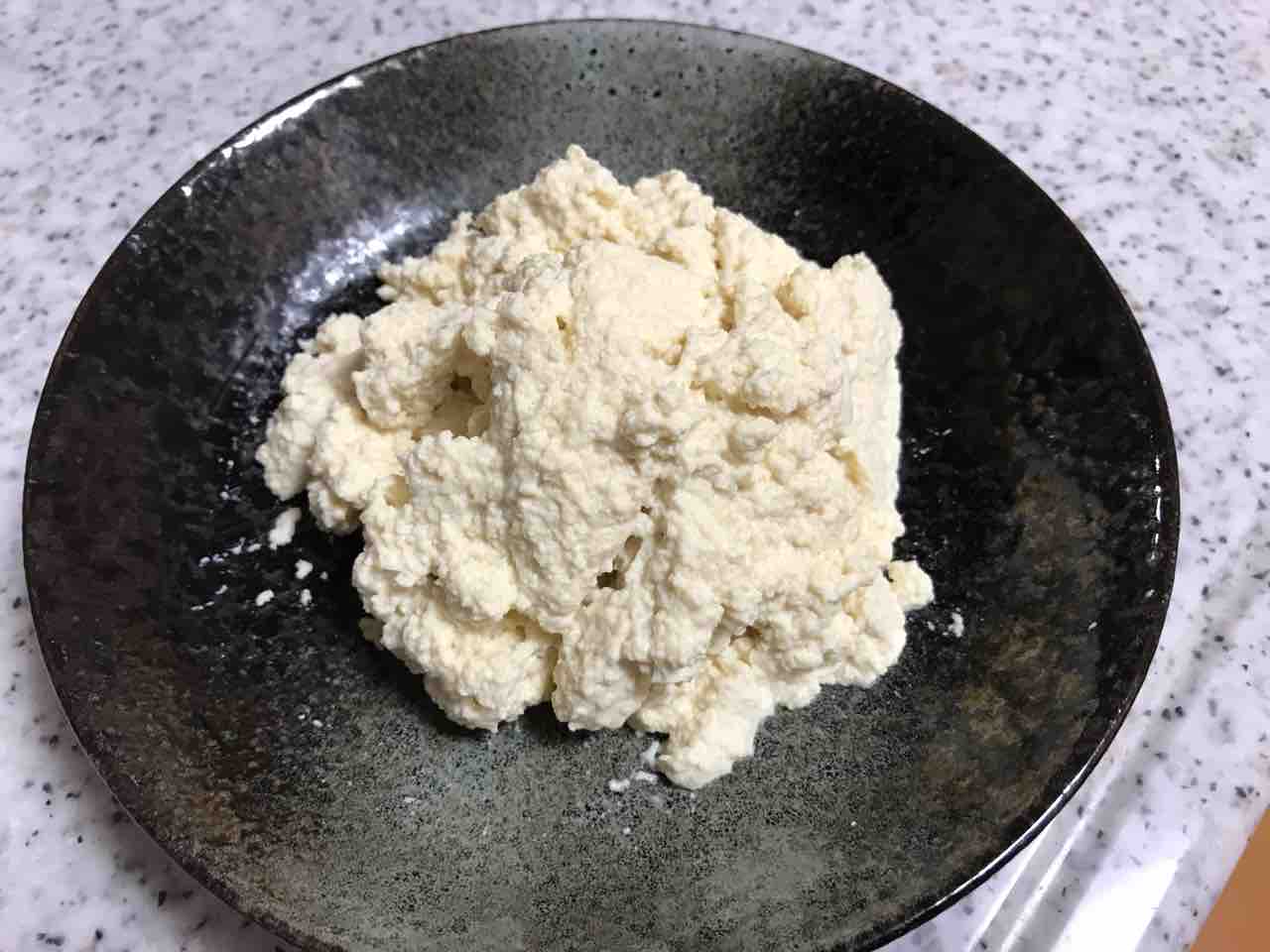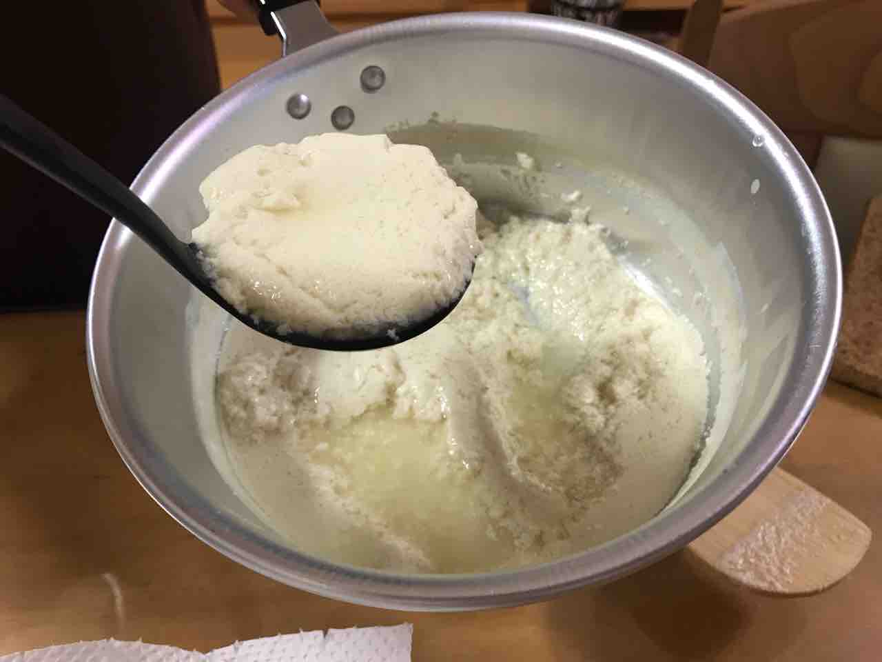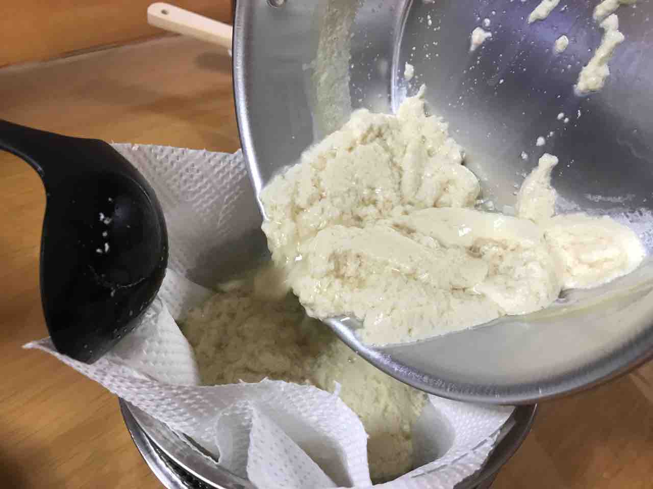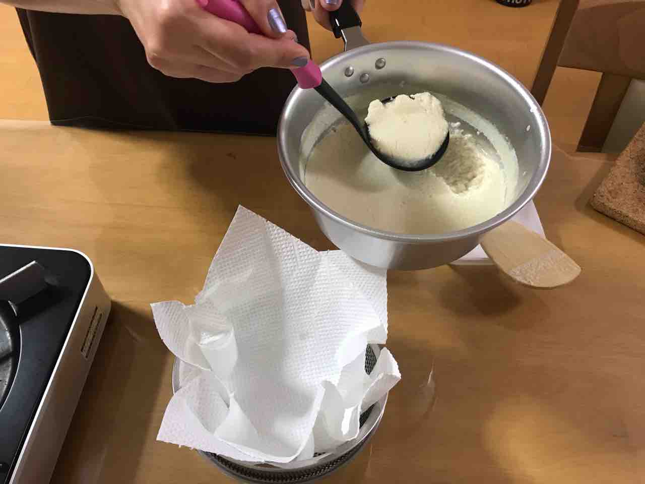 冬場の自販機で買う缶コーヒーくらいの温度?くらいになったらにがりを入れて数回かき混ぜます(男の料理は感覚でやるので正確な温度は不明です)