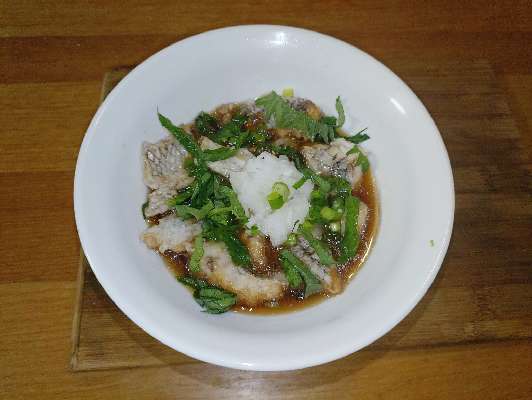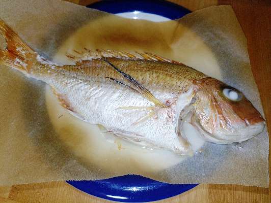 私が釣ったチャリコの塩焼き。半身はMQさんオススメの鯛飯に。この時期のマダイは最高に美味いです。