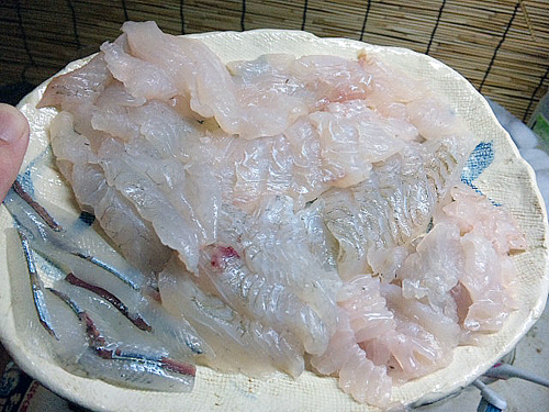 ヒラメの刺身に豚バラの炒め物にキャベツの千切り。