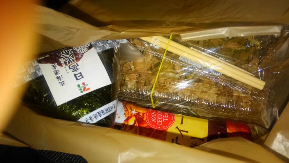 なななんと!嫁殿が、得たいの知れない炒め物とコンビニのオニギリを準備してくれている( ̄□||||!!