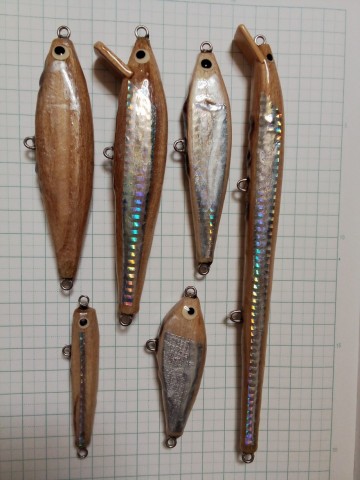 理屈がわかるようになりたくて、同じ形で重りの量や位置を変えたり、頭の形を削り直して見たりして沢山テストしました。感覚的にピンと来た瞬間は、I 字に重りを足したら尻振りした時でした。『なるほど、バランスの崩壊と修復、比重の差、前進力のバランスで動くのか』と。同じ形のミノーで軽いフローティングミノーなら動くけど、シンキングにすると動きが鈍くなる経験と繋がった瞬間でもありました。その頃から、狙ったアクションが作れる確率が上がっていきました。とはいえ思った通りに動いても、その動きがシーバスに効くかどうかわからないのが、市販ルアー釣果ゼロの難しいところではあります。釣れるルアーを作りたいのか、思った通りに動くルアーを作りたいのか、シーバスを釣りたいのか、いったい何をしているのやら、、、ですね。