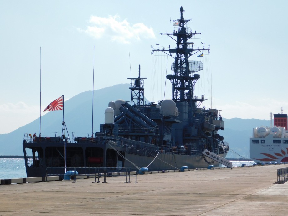 さて、そのドライブに出てみたけどトホホで帰宅途中、大型客船が接岸する岸壁に久しぶりに海上自衛隊の護衛艦が接岸中。