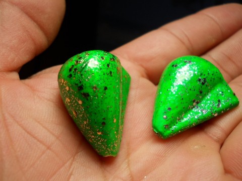 蛍光オレンジの水性塗料がガラクタ箱から出て来たので2つの15号約60gの梶付オモリで現在塗装中。