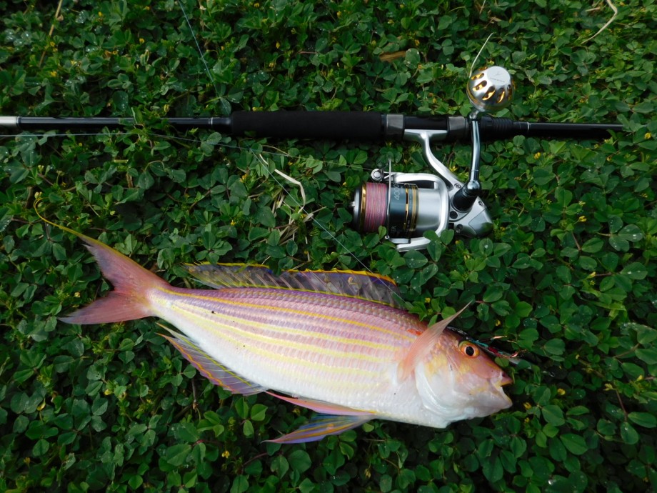 県南通いをはじめてもう数匹のイトヨリを釣っちゃったけど、今日のこれは今までで一番小さくて可愛いサイズの約38cmくらい。