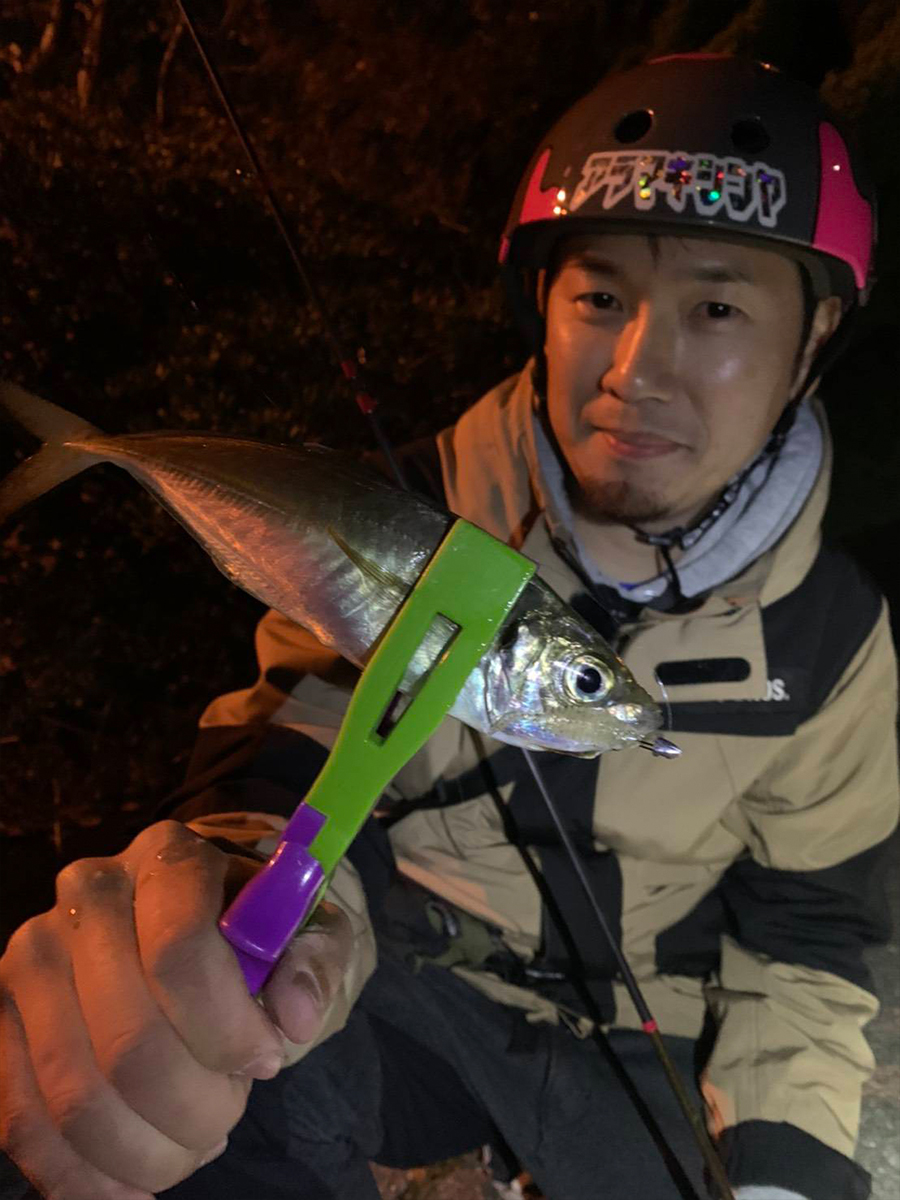 ライト周りのボトムでの反応がないため、中層でドクターチョロの1gジグ単で探ると25cm前後のアジがヒット!さらに立て続けにヒット!