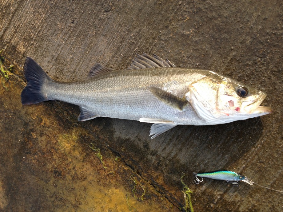 岸から3mくらいを流れと平行に、たるい上げ潮に乗せゆっくりとリトリーブして。。。ゴン!!