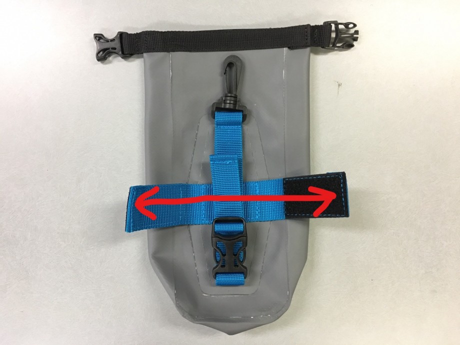 取り付け箇所はカラビナ、横向きに付いたマジックテープ、縦向きにバックル付きのテープの3つが本体裏に装備されています。